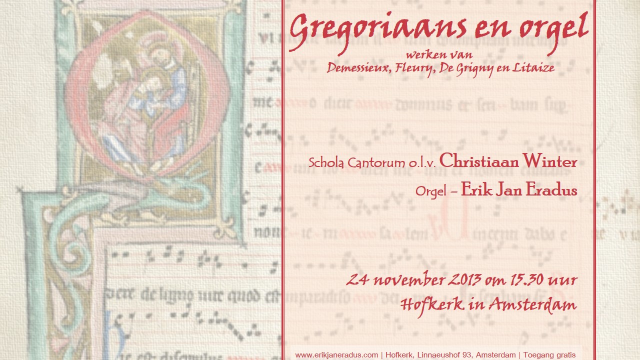 november 20, 2013 Gregoriaans en orgel 24 november 2013 om 15.30 uur Hofkerk, Linnaeushof 93 Amsterdam Geplaatst in Hofkerk Getagged gregoriaans Een reactie plaatsen