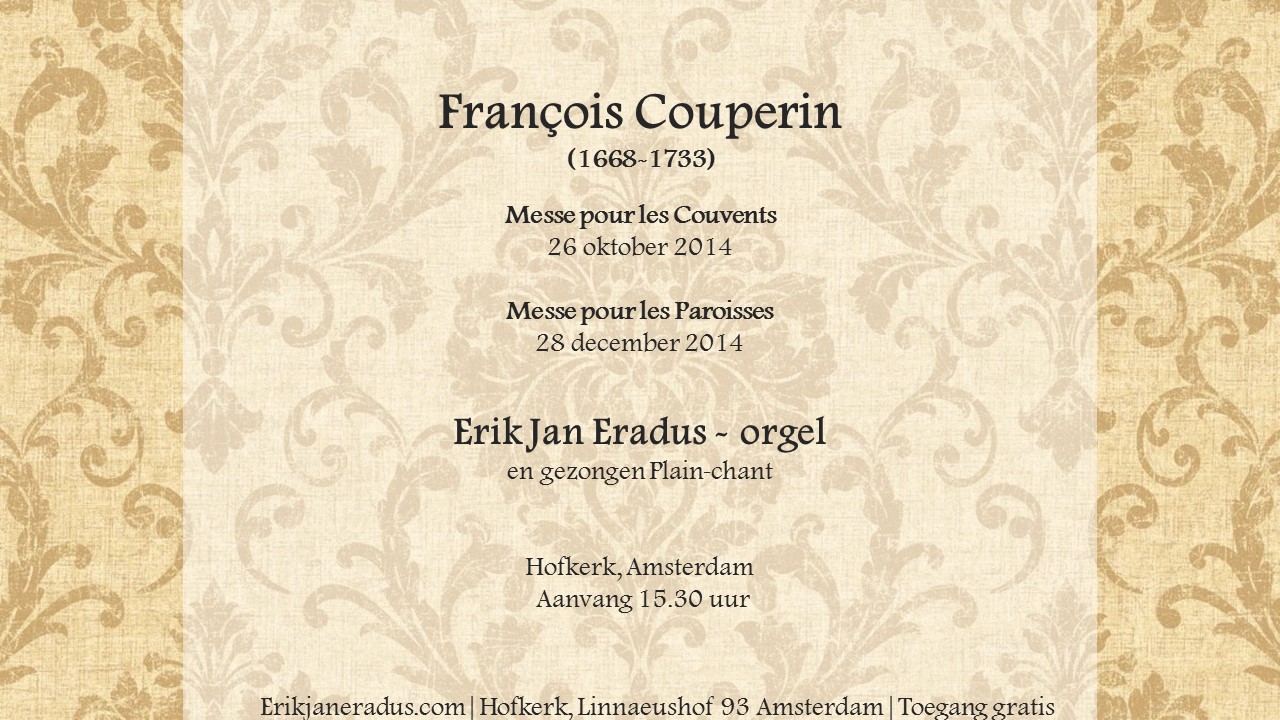 december 21, 2014 François Couperin – Messe pour les Paroisses 28 december 2014 om 15.30 uur Hofkerk, Amsterdam Geplaatst in Uncategorized Een reactie plaatsen