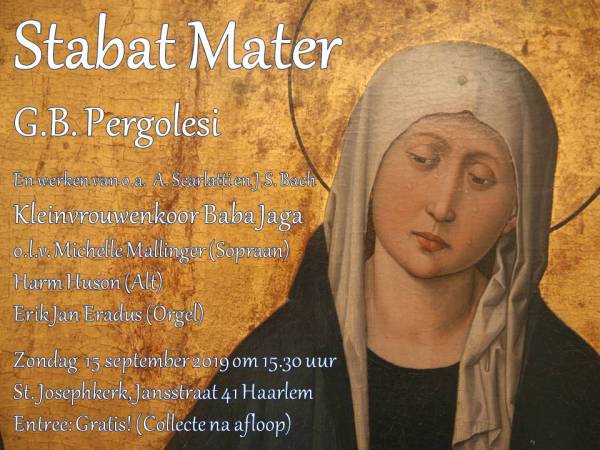 september 11, 2019 Stabat Mater van Pergolesi 15 september 2019 om 15.30 uur St. Josephkerk, Jansstraat 41 Haarlem Geplaatst in Uncategorized Een reactie plaatsen